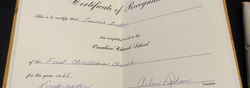 Why, you may ask, am I celebrating graduating Bible school as a toddler? I am celebrating because I don’t have many memories of attending church or celebrating God’s love. As I was cleaning out my office, I found my baby books that my mom gave me several years ago. I must admit I put them in a cabinet for safe keeping but never read through them.