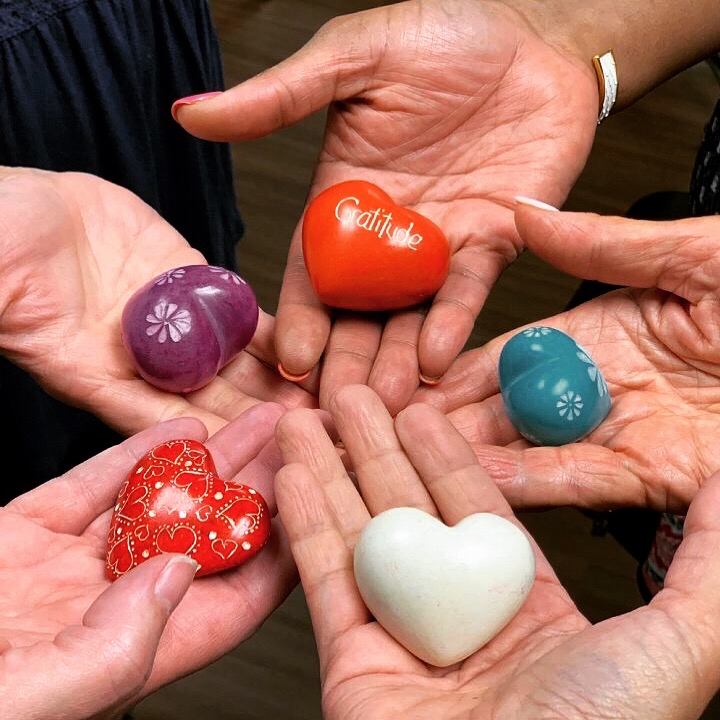 I start by analogizing that the bag is our life. The bag is empty and the things we add to the bag will influence our lives. Now, a participant can choose to throw the bag in a drawer never to be seen again or they can begin to fill it (just like our lives). I insist that the bag only be filled with things the participant personally loves, hence the hearts on the bag. Again, I need it simple, so I offer simple. A heart is the symbol of love so having the bag covered with hearts emphasized what goes in the bag. The bag is a good size but not too big to force participants to feel they have to fill the bag.