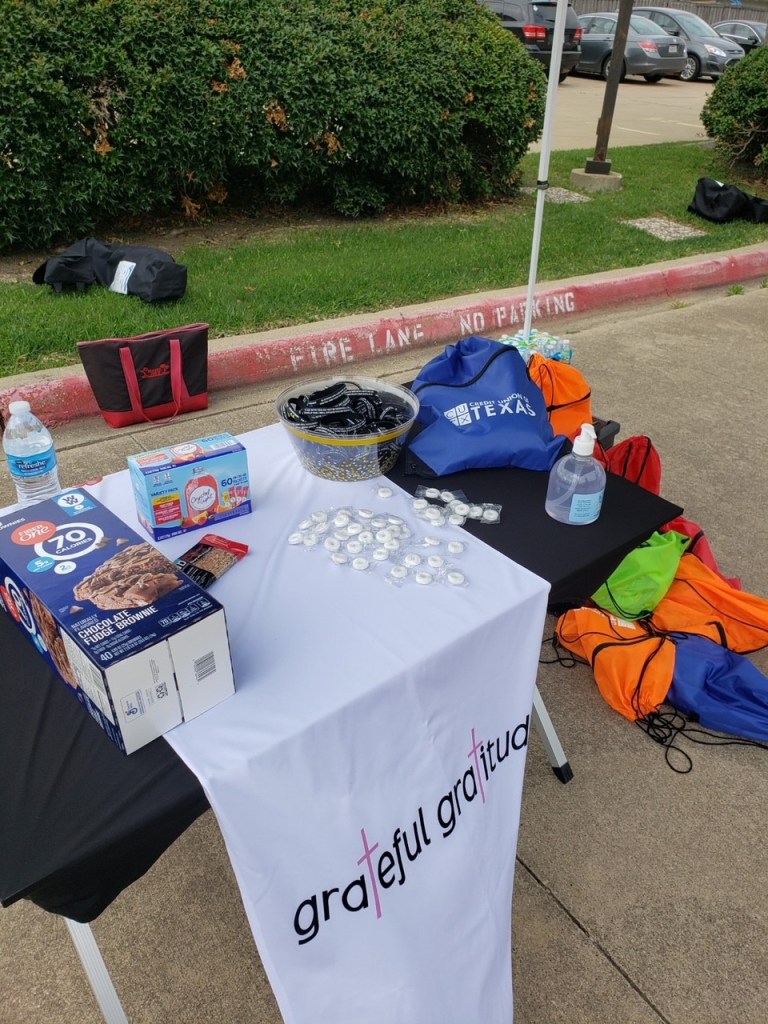 As the first person arrived at our tent, I asked him his name and introduced myself. He smiled and was very kind. The first thing I asked him after our introduction was if he would like a bracelet with a Bible verse. He said he would and as I placed it over his hand and onto his wrist I said, “When you look at this bracelet you can always remember that Jesus is walking with you. If times get dark just read your bracelet and be comforted of His love for you.”. I then offered him a drawstring bag filled with food items. Included in the bag were a tuna fish lunch kit, protein bar, fruit, 2 drinks, mints, granola bar, fruit snacks, and socks.