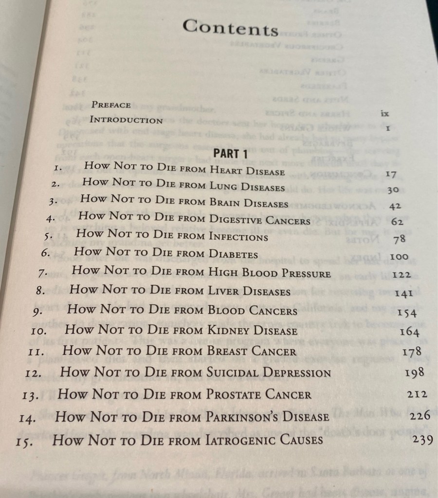 I wanted to include the table of contents from Dr. Greger’s book to show you how not to die from 15 different conditions by eating a whole food plant-based diet. If you take medication for any of these conditions, consider learning more about how this type of eating may save your life, reduce your medicines, and possibly allow you to live longer.